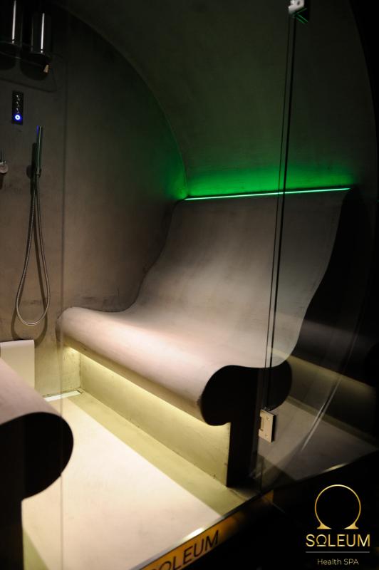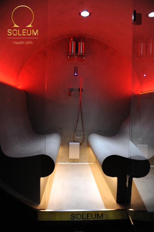 SPA kabina pojme 4 osoby. Jedná se o tepidárium, parní lázeň a SOLEUM (inhalace soli přes nebulizér) vše v jednom.
